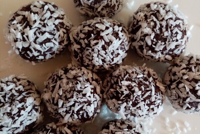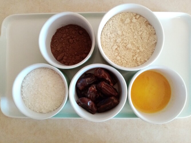 Put the coconut, ground almond, orange rind and juice, cocoa powder and dates in a food processor and blend. Scrape down the sides and blend again to make sure the mixture is well combined.