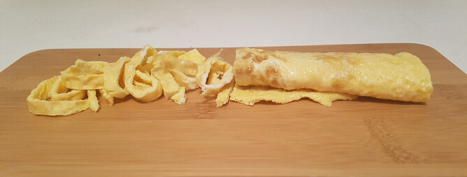 Heat 1 TB of oil in a fry pan. Sautè chopped onions in oil. Fry until translucent (clear). Pour eggs into pan and fry so that it forms omelet. Once cooked roll up and place on a chopping board. Slice rolled egg into strips.